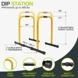 The ProsourceFit Dip Station is a convenient, multifunctional set of parallel workout bars, that is ideal for any home gym or fitness studio. The portable dip bars are lightweight and easy to assemble and take apart, making it great for moving it around to accommodate specific workouts and spaces. Each U-shaped bar is 24-inches wide and is adjustable with 7 levels at 1” increments. An optional (but recommended) 16-inch safety connector is included to keep the base together when needed for a safer workout. When connected, the distance between bars is extendable from 19 ½” to 26 ½” at 1-inch increments with 7 levels. This means users of all shapes and sizes can set it at the ideal size to strengthen your entire upper body. Rubber feet provide traction to keep the dip rack from sliding on hard floors. Padded hand grips on each bar make your workout more comfortable and reduce slipping when hands are sweaty. The dipping station is perfect for upper body and core workouts to perform exercises like tricep dips, L-sits, push-ups, inverted rows and more. Dip bars are a great solution for anyone who wants to build upper body strength without a lot of heavy weights. You can still build muscle using just your bodyweight as you work against gravity. A great tool for gymnasts and anyone wanting to build their chest, shoulder, back, core and tricep muscles. The durable iron bars come in three powder-coated color options: black, yellow and red to suit your personal style!